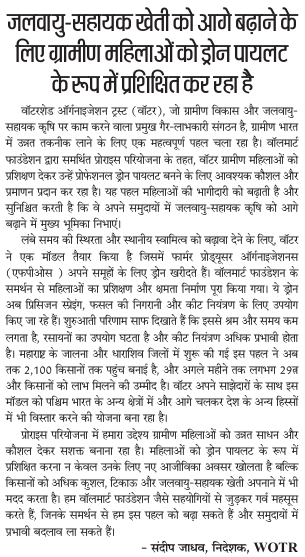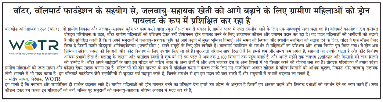 Title: वॉटर, वॉलमार्ट फाउंडेशन के सहयोग से, जलवायु सहायक खेती को आगे बढ़ाने के लिए ग्रामीण महिलाओं को ड्रोन पायलट के रूप में प्रशिक्षित कर रहा है