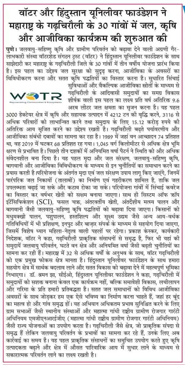Title: वॉटर और हिंदुस्तान यूनिलीवर फाउंडेशन ने महाराष्ट्र के गढ़चिरौली के 30 गांवों में जल, कृषि और आजीविका कार्यक्रम की शुरुआत की